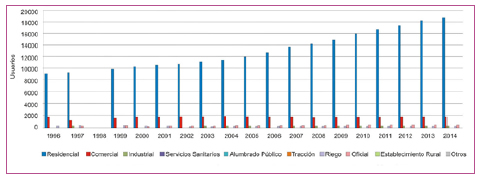 De todos los sectores el residencial es el que presenta la mayor cantidad de usuarios en todos los años analizados, con valores que van desde 9170 usuarios para el año 1996 a 18 835 usuarios para el 2014 (equivalente a un aumento del 105,4 %).