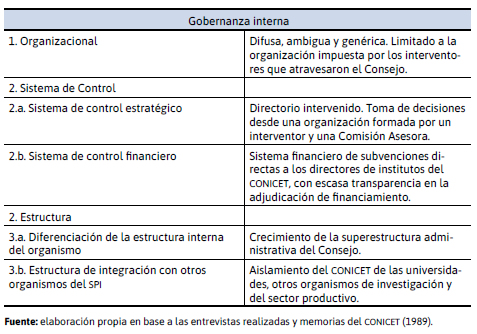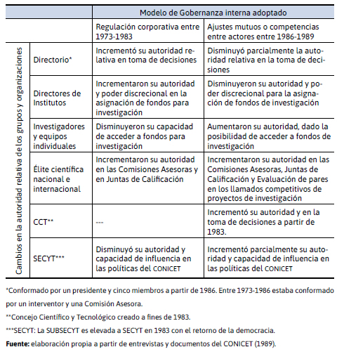 1) A partir de 1973 y con la última dictadura militar, los cambios en los mecanismos de gobernanza en el SPI favorecieron a organismos descentralizados, principalmente al conicet (también a la cnea). Esto favoreció el incremento de la autoridad de las élites científicas organizacionales (directores de institutos del conicet). Estos grupos tenían un alto poder en la obtención de recursos, la asignación de los mismos hacia el interior de los institutos, la definición de agendas de investigación, y en la formación de recursos humanos (designaciones de becas internas y externas).