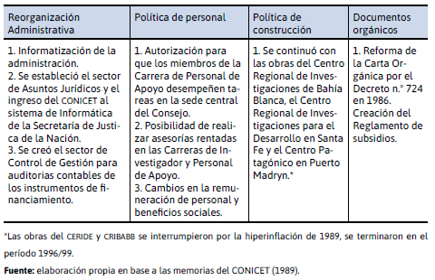 Con la nueva gestión a partir de 1984, el Directorio del conicet fue reconstituido y formalizado en 1986, mantuvo los vínculos con el Consejo Científico y Tecnológico (cct) creado en 1983 como entidad de transición. Según Abeledo: