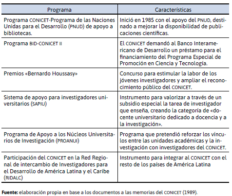 En la Tabla 4 se describen los principales programas llevados a cabo durante la gestión de Abeledo en el conicet. Estos estaban dirigidos a racionalizar, redistribuir y coordinar los recursos del Consejo, apelando a fuentes de financiamiento adicionales cuando la magnitud de las inversiones hizo difícil
