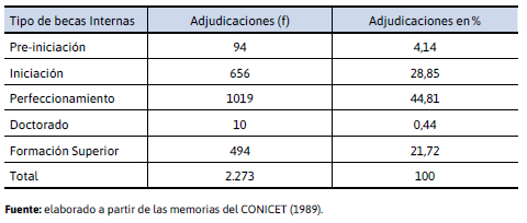 Según la Tabla 5, en relación al objetivo de formación de recursos humanos en investigación en CyT,10 el conicet propuso para 1987 los siguientes cambios en el sistema de becas: i) creación de la categoría beca de doctorado con una duración máxima de cinco años; ii) modificación de la beca de pre-iniciación, con una reducción a un año para poder acceder a una beca de iniciación o doctorado. A partir de 1988, el Programa de Becas se organizó de la siguiente forma: i) becas de nivel cuaternario (becas de pre-iniciación; becas de iniciación; becas de perfeccionamiento; becas de doctorado; becas de formación superior) y ii) becas posdoctorales (becas internas posdoctorales; becas industriales; becas de investigador formado).