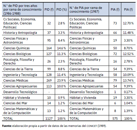 Los pid constituyeron un cambio notable en el sistema de financiamiento de la investigación,9 al habilitar canales de promoción para investigadores y grupos que no pertenecían orgánicamente al conicet. En 1987 se realizaron los primeros llamados a concurso de los pia, destinados a favorecer la consolidación de equipos de investigación, que posteriormente estarían en condiciones de presentarse a un llamado pid (conicet, 1989).