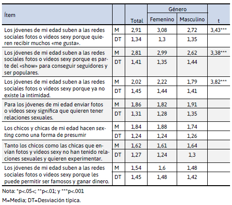 Por otra parte, los datos revelan que existen diferencias estadísticamente significativas en función del género, que muestran que las chicas son quienes más creen que las personas de su edad «suben a las redes sociales fotos o videos sexy porque ya no existe la intimidad» (t=3,82; p<.001), que «los jóvenes de su edad suben a las redes sociales fotos o videos sexy porque esperan