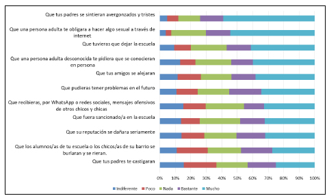 o riesgos, en el caso de que sus imágenes sexy se divulgaran, se encontró una considerable preocupación por todas las circunstancias hipotéticas sugeridas (Gráfico 1). Alrededor del 50 % indicó que les preocupa entre «bastante» y «mucho» «Que los alumnos/as de tu escuela o los chicos/as de su barrio se burlaran y se rieran» (47,6 %), «Que tu reputación se dañara seriamente» (50,5 %), «Que pudieras tener problemas en el futuro» (55,2 %), «Que fueras sancionado/a en la escuela» (48,3 %), «Que fueras sancionado/a en la escuela» (56,8 %), «Que tus padres se sintieran avergonzados y tristes» (74 %), «Que tus padres te castigaran» (43,2), «Que una persona adulta desconocida te pidiera que se conocieran en persona» (54 %), «Que tus amigos se alejaran» (53,9 %), «Que una persona adulta te obligara a hacer algo sexual a través de internet» (70,2 %), «Que recibieras, por WhatsApp o redes sociales, mensajes ofensivos de otros chicos y chicas» (45,7 %).