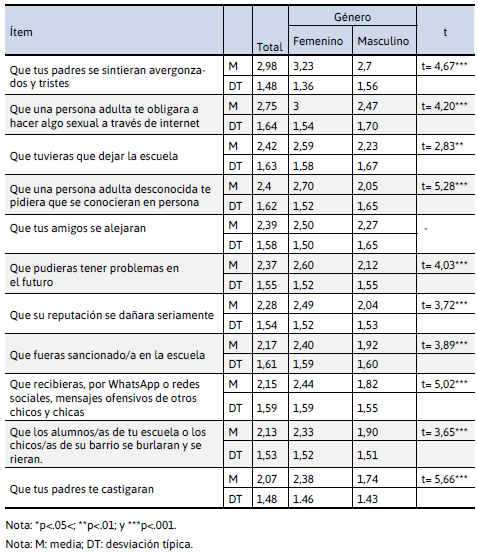 A partir de un análisis de las medias obtenidas en esta escala para una muestra, encontramos que las situaciones que más les preocupan son «Que tus padres se sintieran avergonzados y tristes» (2,98 DT= 1,48) y «Que una persona adulta te obligara a hacer algo sexual a través de internet» (2,75 DT=1,64).