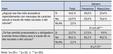 El 13,7 % de los/as participantes respondió haberse sentido presionado/a para enviar fotos/videos sexy a través de redes sociales o del celular. Las diferencias por género indican que las mujeres se han sentido obligadas en un 17,5 % frente al 9,9 % de los varones (X2 8,60; p<.01). En este caso, el 46,8 % respondió que fueron presionados por un desconocido.