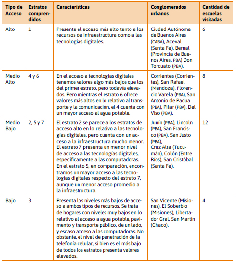 Para llevar adelante el estudio fue seleccionada una muestra representativa y federal compuesta por 30 escuelas secundarias de todo el país. La obtención de la muestra siguió los lineamientos de un diseño polietápico. En primer lugar, la estratificación (clasificación en base a variables socioeconómicas relevantes en los que cada estrato es homogéneo) y luego la selección de conglomerados (agrupamiento por vecindad geográfica). El marco muestral de escuelas comenzó con el listado de 60.934 escuelas argentinas identificadas por la Dirección Nacional de Información y Evaluación de la Calidad Educativa (diniece) para luego ser recortado al grupo de las 18.860 escuelas secundarias. Por último, nos quedamos con las 6.140 secundarias de gestión estatal, urbanas y de educación común, configurando así nuestro marco muestral definitivo. Para la confección de los estratos, decidimos clasificar a las escuelas en función del departamento al que pertenecen en base a datos del censo 2010 tomando seis atributos relevantes. Cuatro de ellos refieren a los rasgos socioeconómicos generales: cantidad de hogares con transporte público, alumbrado público, pavimento, descarga de agua. Los otros dos atributos aluden al vínculo con las tecnologías digitales: hogares con computadora y con celular. En base a la combinación de estos seis atributos se construyeron los diferentes estratos reflejando diferentes contextos desde altos niveles de infraestructura y de acceso a tic hasta niveles bajos en ambos aspectos pasando por situaciones diversas, algunas con algunos indicadores elevados de infraestructura y menores en acceso a tecnología y otros con situaciones inversas. De este modo, tal combinación permitió clasificar el territorio nacional teniendo en cuenta no solamente indicadores socioeconómicos tradicionales sino también otros específicamente relevantes para nuestro objeto de estudio.