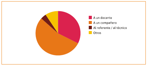 De manera coherente con lo visto anteriormente, el gráfico de torta pone de manifiesto que las y los estudiantes no solo identifican a sus pares como calificados para dar consejo respecto de las tecnologías digitales, sino que también los perciben como accesibles en términos prácticos. Por otro lado, si bien, como vimos más arriba, los docentes no son percibidos como muy hábiles, se recurre a ellos, posiblemente, porque son accesibles. Por el contrario, los Referentes Técnicos Escolares (rte), conceptualizados como capaces, no son actores cercanos a la cotidianeidad de las y los estudiantes.