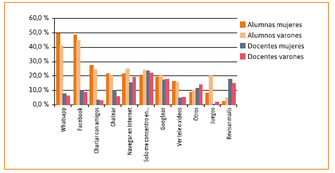 Como vemos, entre las y los estudiantes se destacan las interrupciones comunicativas con una leve preponderancia entre las mujeres. Esto resulta coherente toda vez que, como vimos en la sección anterior, las plataformas comunicacionales constituyen un ámbito reconocido para el acceso al conocimiento y el aprendizaje informal. La distancia respecto a la representación de las y los docentes es clara: los alumnos eligen más opciones (es decir, optan por más respuestas múltiples, por más actividades simultáneas cuando leen un texto), y que las opciones de distracción varían entre los dos tipos de actores: los alumnos se abocan a las mencionadas acciones comunicativas y, eventualmente, a los juegos (especialmente los varones), mientras que las y los docentes destacan el navegar por Internet, revisar mails y buscar bibliografía.