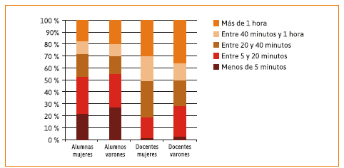 Una pregunta complementaria de las encuestas refería a cuánto tiempo permanecían concentrados, estudiantes y docentes, en un texto sin interrumpir la lectura por otros estímulos. La Figura 3 muestra las respuestas de docentes y alumnos, según género.