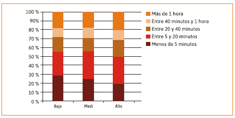 En efecto, cuanto menores son los niveles de educación formal el tiempo de concentración focalizada es menor. Esto podría deberse a que los adultos de hogares con mayores niveles de educación formal posiblemente estén más formados en la habilidad de la concentración focalizada, toda vez que ésta habilidad era decisiva en los estudios que han cursado. Así, es probable que hubieran inculcado esa destreza a su descendencia en mayor medida que los hogares con niveles de educación formal más bajo. Tal como lo han señalado diversos autores (Livingstone y Bober, 2005; Helsper, 2015), estaríamos aquí ante una nueva evidencia que las habilidades digitales se heredan por clase social entre generaciones. Nuevamente, lejos de ser innatas e inmanentes a toda la población juvenil, se trata de procesos que podrían redundar en procesos de acumulación de ventajas y/o desventajas (Saraví, 2015).