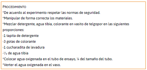 En la actividad experimental a realizar al mezclar peróxido de hidrógeno (agua oxigenada) con un fermento realizado con levadura (que actúa como catalizador), se acelera la descomposición del peróxido, produciéndose una espuma que se puede visualizar mejor al agregar detergente y colorante. Las actividades realizadas en esta instancia incluyeron una puesta en común donde cada grupo presentó su diseño experimental, indicando las decisiones tomadas y analizando el resultado de la reacción. Se compararon los resultados obtenidos por los diferentes grupos, con el objetivo de determinar las variables intervinientes y la relación entre ellas. Por último, los docentes reflexionaron sobre las posibilidades de que ocurra esta reacción química en la vida cotidiana, las precauciones a tener en cuenta a la hora de manipular los reactivos y la necesidad de realizar cambios en el protocolo del tpl que elaboraron, de acuerdo a las características de los estudiantes y de la institución en donde trabajan.