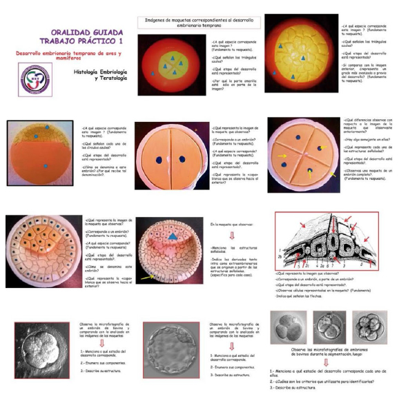 Para cada uno de los trabajos prácticos se elaboró una guía de oralidad. Cada guía consistió en un archivo en PowerPoint, donde se incluían imágenes y consignas orientadoras de la oralidad. Las imágenes se obtuvieron de los materiales utilizados por los estudiantes durante los tp, ya sea fotografías de maquetas del desarrollo temprano de aves y mamíferos, microfotografías de embriones y de tejidos y órganos obtenidas de preparaciones histológicas, y esquemas de las guías teóricas.