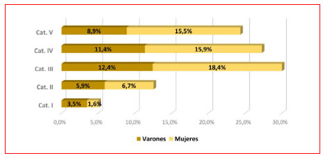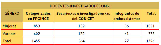 La distribución de docentes-investigadores/as según categorías de investigación del proince revela una estructura claramente jerarquizada en la unsj. Del total de docentes registrados, solo una baja proporción ha logrado alcanzar las categorías más altas: hay un 5 % de categorizados i y 13 % de categorizados ii. Respecto a las categorías más bajas, agrupan conjuntamente al 82 % de todo el cuerpo docente: la categoría iii o intermedia agrupa la gran mayoría (31 %) y le siguen las categorías iv (27 %) y V (24 %) respectivamente. En cuanto a su distribución por género, también se advierten ciertas asimetrías: si bien el 58 % de las categorizadas son mujeres y el 42 % varones, estos últimos predominan en la cúspide del Programa (9,5 % sobre 7,6 %).