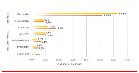 Una mirada simple y totalizadora sobre la distribución de puestos del conicet entre docentes varones y mujeres permite apreciar una relativa paridad (50,7 % y 49,3 %). No obstante, existe una importante segmentación interna: la mayoría de las docentes se desempeñan como becarias del Consejo (36 % frente a un 30 % de varones) y ellos hegemonizan todas las categorías de la carrera científica: 14 % frente a 10 % en asistentes y adjuntos; 3,5 % frente a 1,8 % en independientes; 2,3 % frente a 1,5 % en principales y 0,6 % correspondiente a los únicos 2 investigadores superiores.