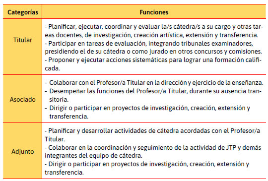 • Categorías: de Profesor/a Ordinario (Titular, Asociado, Adjunto, jtp u Auxiliar de Primera Categoría7) o Extraordinario (Honorario, Emérito, Consulto y Visitante).
