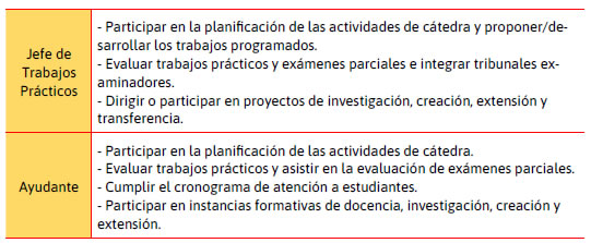 El reglamento de Carrera Docente de la unsj define con claridad las funciones asociadas a los diferentes cargos conforme a sus categorías, promoviendo una serie de actividades específicas que deberán ajustarse a las respectivas dedicaciones horarias, pero que están atravesadas por ejes de acciones generales como la planificación, ejecución de actividades de cátedra e instancias de evaluación. Por un lado, ello contribuye a limitar la histórica dispersión de labores entre los diferentes roles docentes, resquebrajando la rígida estructura de cátedras preexistente. Y, por otro lado, si bien pondera las tareas propiamente docentes de enseñanza y aprendizaje, habilita un espacio de articulación con otras actividades complementarias como las de investigación, extensión, transferencia e incluso la creación artística. Cabe señalar que esta casa de estudios y la Universidad Nacional del Comahue han sido las únicas, hasta el momento, en incorporar a «la creación» entre las funciones generales del profesorado universitario (De la Fare, Rovelli y Lenz, 2013).