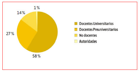 Según datos del Instituto Nacional de Estadísticas y Censos (indec, 2020), la unsj cuenta a la fecha de este estudio con 7.086 cargos distribuidos del siguiente modo: 4.154 para docentes universitarios, 1.887 para docentes de nivel preuniversitario, 991 para no docentes y 54 para autoridades. Tal como muestra el gráfico precedente, la docencia universitaria (y sus roles complementarios) se revela como el escalafón que acumula la mayoría de los cargos disponibles (58 %), de allí que resulte relevante centrar la lupa analítica en torno a su configuración específica.