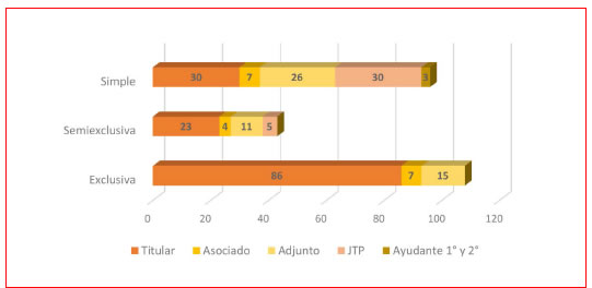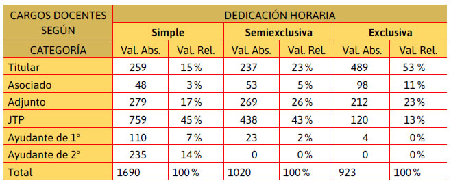 • Dedicaciones: Simple (diez horas semanales), Semiexclusiva (veinte horas semanales) y Exclusiva (cuarenta horas semanales).