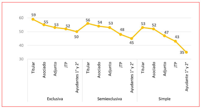 Ahora bien, el gráfico precedente muestra que el promedio etario asume valores diferenciales en función de las categorías y dedicaciones docentes. La curva de edad desciende no solo desde las más altas dedicaciones a la más baja, sino también conforme a las jerarquías de los cargos. Los profesores/as titulares y asociados, que cuentan mayoritariamente con dedicaciones exclusivas y semiexclusivas, son los más cercanos a las edades jubilatorias instituidas por la Ley n.º 26.508 (60 años para mujeres y 65 para varones), mientras que las/los jtp, adjuntos o auxiliares, que cuentan en su mayoría con dedicaciones simples, constituyen el segmento más joven.