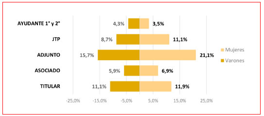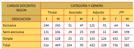 La pirámide jerárquica de cargos en la unsj revela una estructura académica relativamente feminizada, representada por un 54,3 % de profesoras sobre un 45,7 % de profesores. Respecto a su configuración en las distintas categorías, los puestos más altos (titulares y asociados) están comandados por un 19 % de mujeres frente a un 17 % de varones. En la categoría de adjuntos, también predominan las mujeres, que concentran un 21 % de cargos sobre casi un 16 % de varones. A nivel de los jtp se imponen también las mujeres con 11 % sobre 8,7 % de varones. Solo en el escalafón inicial, correspondiente a los cargos de Ayudantes de 1° y 2°, predominan los varones (4,3 % sobre 3,5 %). Pero veamos ahora la relación del género en los cargos docentes, no solo respecto a las categorías detentadas sino en función de sus dedicaciones.