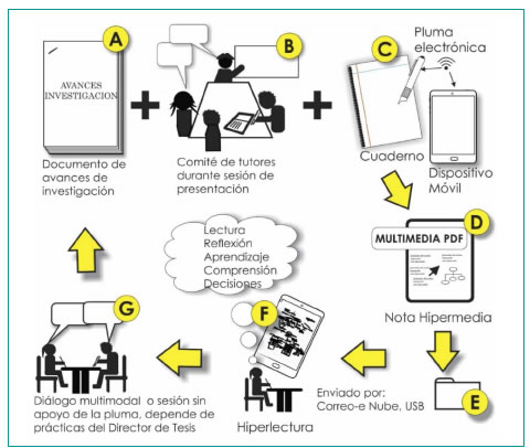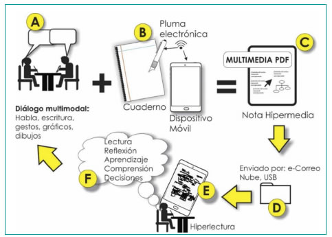 La tutoría uno a uno se organiza en una serie de sesiones presenciales acordadas por el tutor y el tutorado. Para la realización de la nota, se utiliza un cuaderno de hojas especiales y una pluma electrónica vinculada a un dispositivo móvil (todos disponibles comercialmente, figura 1-B); la mayoría de las veces –en las experiencias documentadas– las notas son realizadas por el tutor. El cuaderno sirve a manera de «pizarra», complementando el discurso hablado (figura 1-A); las notas son visibles para el estudiante durante la sesión; el tutor escribe conceptos, elabora esquemas y se enfatizan relaciones y categorías. Una vez finalizada la sesión de tutoría, la nota electrónica e hipermedia es enviada al estudiante (figura 1-C-D). El estudiante utiliza estas notas para realizar otras personales, escuchar y reflexionar, para comprender, informarse y aprender (figura 1-E-F) (Aguilar Tamayo, 2014).