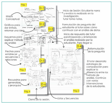 En la Figura 3 se presentan cuatro páginas de anotaciones producto de una sesión de tutoría con duración de 1 hora 8 minutos. La estudiante desarrolló durante los primeros 7 minutos el relato sobre el análisis de los datos realizado hasta ese momento y formuló una pregunta a manera de problema –¿cómo continuar el análisis y organizar los primeros resultados obtenidos?–, estableciendo con ello el tópico y un elemento central para el tutor en desarrollo del abordaje didáctico (ver Figura 3, D-1 y D-2).
