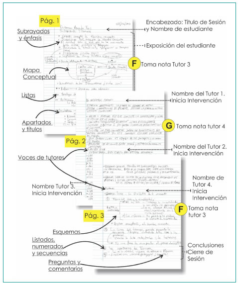 En el contexto de la tutoría, las notas son producto de un proceso colaborativo, y la escritura se realiza en presencia del lector estudiante. Aun cuando el estudiante no interviene directamente en la escritura, la nota es producto del diálogo entre el tutor y tutorado, ya que el propósito de la sesión tutoral es proporcionar ayuda al estudiante; las preguntas, discusiones, argumentos, metáforas y ejemplos deben ser parte del proceso de negociación de significados.