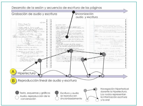 En la figura 5-B, la flecha representa la reproducción lineal de audio en la cual la escritura se reproduce al tiempo que avanza la grabación de audio. Pueden hacerse saltos, avances y retrocesos en la grabación mediante una línea de tiempo.
