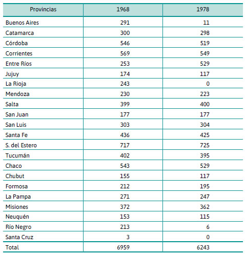 Salvo en Santiago del Estero, donde se crearon ocho escuelas nacionales, y unas pocas provincias donde se mantuvo la cantidad de escuelas, a partir de 1968 su número comenzó a descender, a lo que se agregan las transferencias realizadas en Buenos Aires, La Rioja y Río Negro. A pesar de ello, quedaban por transferir 6.243 escuelas, lo cual implicaba, según fuentes oficiales, a 44.327 docentes y 742.712 estudiantes (Tabla IV).