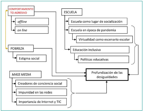 Abstract: Objectives: to understand adolescents’ aggressive behavior in contexts of cultural deprivation, explore their use of digital social networks and look into whether the aggressive manifestations expressed there were modified during the covid-19 pandemic. The Grounded Theory method was used based on a female key informant’s discourse interpretation obtained through interviews. Inductive categories of analysis were established: aggressiveness, poverty, school and mass media. The impact of the context of poverty on the organization of subjectivity and the social function of school from the perspective of inclusion were emphasized. It is concluded that adolescents from deprived contexts have lost their freedom (Sen, 2000) to use their capacity to obtain good life quality and the increase in their social vulnerability depends on multiple factors such as the media, ict, education policies and social stigma.