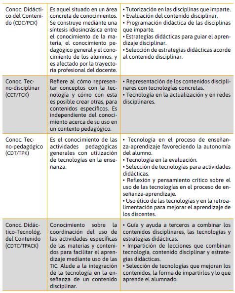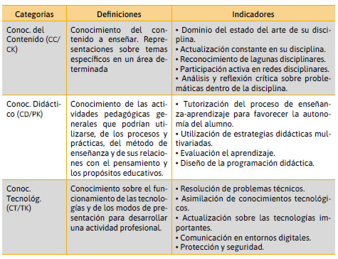 En la Tabla 1 se presenta una síntesis de sus definiciones con sus respectivos indicadores, elaborada por Flores, Ortiz y Buontempo (2018) a partir de la revisión de otros trabajos (Koehler, Mishra y Cain, 2015; Cejas-León, Navío y Barroso, 2016).
