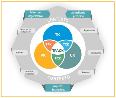 En relación con lo anterior, Angeli y Valanides (2009) y Cabero (2014) indican que el marco de saberes no puede estar abstraído del contexto que lo enmarca, las ideas acerca del aprendizaje, la estructura organizativa, la autopercepción en el uso de las tic, los elementos intangibles (cuestiones ideológicas y éticas) que subyacen al currículum y la acción del docente en el escenario concreto donde actúa.