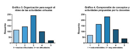 En el Gráfico 4 se observan las respuestas con ítems escalares (siendo 1 el extremo más negativo y 5 el más positivo). Con estas escalas se indagó sobre el modo en que calificaban su propia organización para las tareas académicas, el grado de comprensión conceptual, el tipo de acompañamiento recibido y el vínculo con sus docentes.