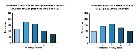 El análisis de sensación de acompañamiento por parte de los/as docentes (Gráfico 5) y la relación o vínculos con los/as mismos (Gráfico 6) muestra una distribución diferente. La moda 3 es menor (25,6% en ambos casos) en relación con los parámetros de evaluación propia de los/as estudiantes, con una tendencia a mejor valoración de las respuestas positivas [4-5] (27,4% y 36,7%, respectivamente), alcanzando valores de 11,2% y 16,2%, respectivamente, para la respuesta 5 (mejor valoración).
