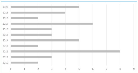 Para la elaboración del estado de conocimiento de la tecnociencia en Iberoamerica se llevó a cabo una identificación de las publicaciones científicas relativas a dicho concepto en las bases de datos de RedAlyc, Scielo, Dialnet y doaj, en las redes sociales académicas de Academia.edu y ResearchGate, y en el buscador de Google Academics, seleccionando escritos en español y con un corte temporal del año 2010 al 2020. Se obtuvo un total de 43 textos de acceso abierto, cuya publicación por año aparece en el Gráfico 1.