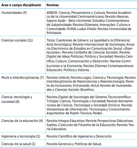 Las revistas de humanidades y de ciencias sociales fueron las áreas de mayor recurrencia –sobresaliendo disciplinas como la filosofía y la sociología– y concentraron la mayor aportación de conocimiento sobre el tema. Se destaca el registro de cuatro revistas especializadas en el tema de la tecnociencia, tres de ellas en la perspectiva del campo cts.