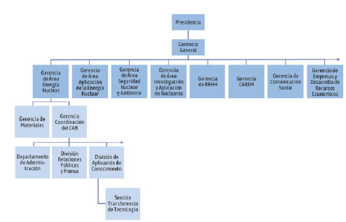 De estos proyectos, los relativos a generación eléctrica, como la extensión de vida de Embalse y terminación de Atucha ii, tuvieron como responsable de su ejecución a la empresa Nucleoeléctrica Argentina s.a. y contaron con la asistencia técnica de la cnea, además de la participación de una gran cantidad de empresas nacionales proveedoras de productos o servicios (Rodríguez, 2021). En el organigrama de la cnea (ver Gráfico 2), en primer nivel de apertura, la Gerencia de Área de Energía Nuclear estuvo a cargo de estos proyectos (Decreto pen N.º 1612/06; CNEA, 2007). En el caso del RA-10 y carem25, el responsable de su ejecución fue la cnea, quien conformó gerencias específicas que centralizaron y afectaron sus actividades a estos proyectos. En el caso del Plan Nacional de Medicina Nuclear «Nucleovida», además de la formación de recursos humanos y asistencia técnica de la cnea, se realiza la producción de radioisótopos en el Centro Atómico Ezeiza y se ejecuta con la participación de otros organismos públicos y privados del sector sanitario nacional, como hospitales, sanatorios y fundaciones del campo médico (cnea, 2015; Resolución MinPlan N.º 831/15).