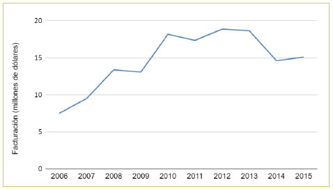 En el período comprendido entre 2006 y 2015, se incrementaron los ingresos por vytt en la cnea de acuerdo a la facturación declarada en las memorias anuales de la institución en el marco de la Ley N.º 23.877, que se observan en el Gráfico 3. Estos ingresos se duplicaron, pasando de 7,5 a 15 millones de dólares estadounidenses entre 2006 y 2015, respectivamente. Entre las uvt que realizaron la administración de estos ingresos, se reportan la fjab, el Foro de Ciencia y Tecnología para la Producción, la Cooperativa del Departamento de Física y el Polo Tecnológico Constituyentes. En el Gráfico 4, se señala que el promedio facturado por la fjab en esos años representó el 81,7 % del total. De hecho, entre el 77 y el 89 % del total facturado en cada uno de esos años corresponde a los montos administrados por esa uvt, lo que la convierte en la más representativa de las actividades de vytt.