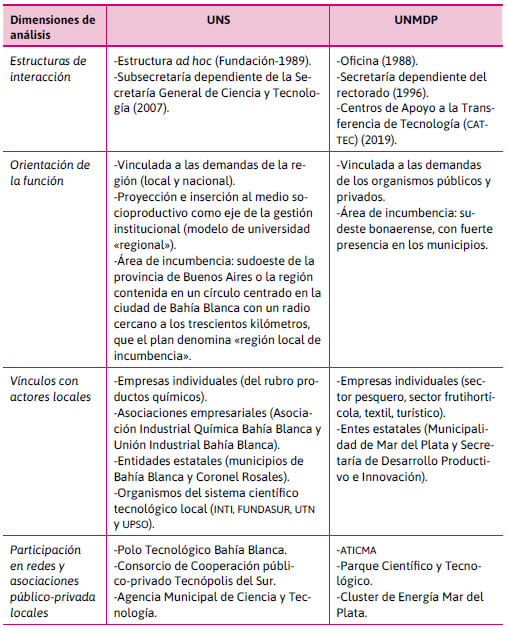 En cuanto a con qué actores se vincula y la forma de articulación con su entorno territorial inmediato, se puede señalar que la UNS desarrolló vínculos diversificados con múltiples actores públicos y privados, incluyendo empresas, asociaciones empresariales, municipios y organismos del sistema científico-tecnológicos emplazados geográficamente en su territorio como así también con otros actores públicos y privados radicados más allá de su frontera geoespacial. Asimismo, se pudo constatar la participación de la universidad en distintas instancias de articulación asociativas a través de la generación de polos tecnológicos o formación de clusters (Polo Tecnológico de Bahía Blanca y Consorcio de Cooperación Tecnópolis del Sur), asumiendo en la mayoría de los casos un rol de hacedor de las iniciativas público-privadas vinculadas a la innovación y el desarrollo encontradas a nivel territorial. Por su parte, en el caso de la UNMDP se observa una menor diversificación de vínculos con actores públicos y privados, focalizado sobre todo en las empresas, y una escasa participación en las distintas instancias de articulación público-privado presentes en el territorio, asumiendo más un rol de asesor y/o consultor de dichas iniciativas.