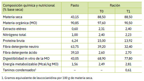 Para conocer la calidad nutricional de la dieta animal se tomaron muestras representativas, determinándose el contenido porcentual de materia seca (De La Roza-Delgado et al., 2002), materia orgánica (aoac 942.05, 1995), nitrógeno total (aoac 984.13, 1995), extracto etéreo (aoac 920.39, 2005), fibra detergente neutro y fibra detergente ácido (Goering H. y Van Soest P., 1970), digestibilidad in vitro de la materia orgánica (divmo) (Tilley J. y Terry R., 1963), energía metabolizable (estimada como 3,608 Mcal x divmo, Ankom Tech. Corp., Macedon, Nueva York, Estados Unidos) y taninos condensados (Porter et al., 1985).