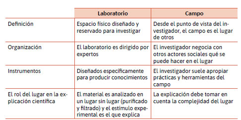Los laboratorios están diseñados para separar el material de investigación de posibles contaminantes, tanto naturales como humanos. Así, se convierten en «lugares sin lugar», más o menos libres de las vicisitudes y promiscuidades del exterior (Kohler, 2002b). Según Guggenheim (2012), el laboratorio es un procedimiento (más que un espacio físico per se) que produce una separación entre un exterior (un entorno que se considera insignificante para alguna reivindicación epistémica o invención tecnológica) y un interior (un entorno parcialmente controlado que se considera relevante para la reivindicación o invención). Las agencias humanas y no-humanas, en el campo, no pasan por el mismo filtro cultural y material de los laboratorios. En el campo, las agencias del lugar pueden dominar al investigador (como tormentas, pestes, invasores). Por estos motivos, Kohler (2002b) planteó que, en el campo, el investigador vive, muchas veces, su impotencia para dominar su entorno y ordenarlo a fin de producir conocimientos. Esto no quiere decir que el campo sea algo que preexiste a la investigación o que simplemente se imponga sobre el investigador. Como nos permite observar el trabajo de Browne (1992), los investigadores interpretan e intervienen sobre los nuevos lugares en función de sus ideologías y capacidades técnicas.