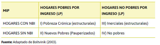Esta metodología aplicada por el indec se basa en el criterio de que la lp y nbi son enfoques complementarios que pueden integrarse en un solo abordaje que resulte más abarcador del fenómeno de la pobreza. Implica la combinación de información de censos y encuestas. El entrecruzamiento de informaciones produce cuatro grupos situacionales para los hogares según el nivel e intensidad de carencias que presentan.