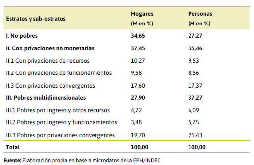 Los pobres por ingreso y una dimensión adicional de recursos o funcionamientos (sub-estratos III.1 y III.2) sumados tienen una representación relativa bastante baja de hogares (8,20 %). Pero al interior de la estructura denotan situaciones diferenciales: los pobres por ingresos y otros recursos reflejan privaciones materiales y precariedad aunque no tienen afectados sus funcionamientos (trabajo, salud, educación) lo que los posiciona con más capacidades para lograr en el futuro mejorar sus condiciones de vida. En el otro sentido, los pobres por ingresos y comprometidos sus funcionamientos, aunque tengan recursos materiales básicos difícilmente puedan salir por si solos de las trampas de la pobreza por falta de capacidades.