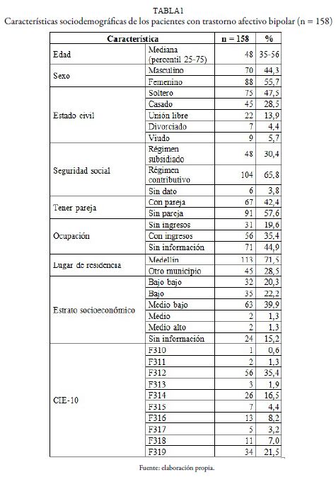 Entre las variables demográficas más relevantes se encontró que la mediana de la edad fue de 48 años. El 55,7% (88) eran mujeres, el 57,6% (91) no tenía pareja, el 65,8% (104) pertenecía al régimen contributivo, el 35,4% (56) tenía algún tipo de ingreso y el 84,2% (133) residía en zona urbana (tabla 1).