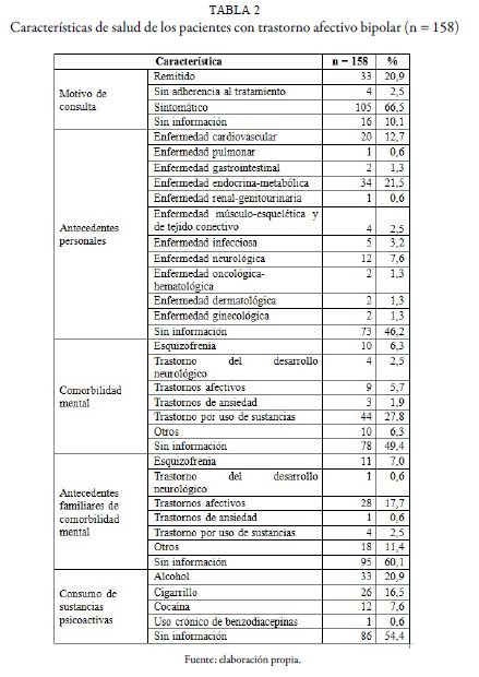El principal motivo de consulta de ingreso al servicio de hospitalización fue la presencia de síntomas relacionados con TAB, con un 66,5% (105). En cuanto a los antecedentes de los pacientes, se encontró que el grupo de enfermedades que predominaban eran las endocrinas y las metabólicas, con un 21,5% (34). La principal comorbilidad mental fue el TUS, con un 27,8% (44), y el antecedente familiar mental para los trastornos afectivos fue del 17,7% (28) (tabla 2).