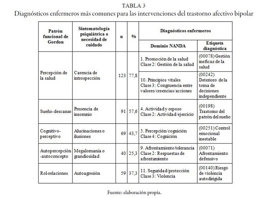 Con la lista de chequeo elaborada con los patrones funcionales de Marjory Gordon, se obtuvieron los principales síntomas psiquiátricos y las necesidades de cuidado de los pacientes con TAB. Estas necesidades se interrelacionaron con las etiquetas diagnósticas de la NANDA y se utilizó la taxonomía II de la NANDA 2015-2017 para extraer los diagnósticos de enfermería (tabla 3).