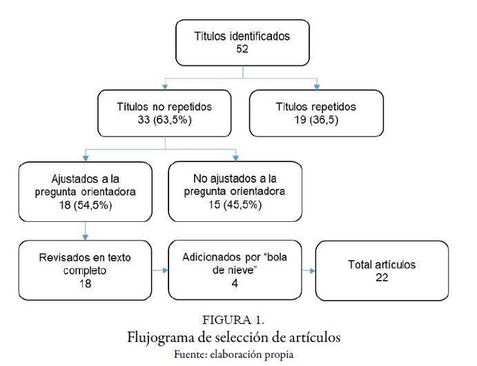 La revisión integrativa buscó artículos bajo la pregunta orientadora ¿cuáles son las prácticas de enfermería en cuidado paliativo de pacientes con heridas oncológicas en cuanto al manejo del exudado, dolor y olor? en las bases de datos IdeA, Pubmed, ScienceDirect, SciELO, ProQuest y Dialnet. Como criterios de inclusión se consideraron artículos relacionados con cuidados de enfermería o manejo de herida tumoral que fueran ensayos clínicos, observacionales, revisiones, metanálisis, experimental/cuasi experimental o serie de casos, que se hubiesen publicado entre el 2000 y el 2017, en idiomas inglés, español o portugués. Todo ello con las palabras clave obtenidas del MeSH: palliative care, nursing, wound, ulcer, neoplasm; también con las palabras clave obtenidas del DeCS: cuidados paliativos, enfermería, herida, úlcera, tumor. No existen descriptores específicos para heridas tumorales, por lo cual se cruzaron descriptores y palabras clave mediante los booleanos AND y OR. En la revisión se identificaron los títulos que tuvieran dos o más de las palabras clave y se eliminaron los repetidos. Se revisaron los resúmenes para seleccionar los que tuvieran temáticas ajustadas la pregunta orientadora. Se obtuvieron los artículos en texto completo, se hizo segunda selección y, con los considerados pertinentes, se adelantó revisión y lectura crítica, en una matriz diseñada por las autoras en una hoja de cálculo en Microsoft Excel versión 2011. Se excluyeron aquellos artículos que trataban sobre heridas crónicas no oncológicas. La figura 1 presenta el flujograma de selección. Por bola de nieve se identificaron otras publicaciones; además, se hicieron nuevas búsquedas para respaldar y argumentar los hallazgos obtenidos.