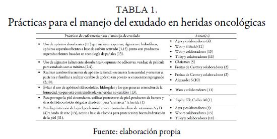 Agra y colaboradores ( 4) coinciden con lo descrito por Woo y Sibbald ( 12) sobre el uso de apósitos superabsorbentes a base de carbón activado, alginato de calcio, espumas e hidrofibras; adicionalmente, Woo y colaboradores ( 13) recomiendan complementar con productos basados en la tecnología de pañales, por su alta capacidad de absorción. Las espumas son moderadamente absorbentes y no adhesivas para facilitar su retiro ( 5). Por su parte, Freitas de Castro y colaboradores ( 2) mencionan cambios frecuentes de apósito, teniendo en cuenta la necesidad, y orientar al paciente y familiar a realizar cambio de apósito tan pronto como se encuentra impregnado. Para la protección de la piel perilesional sana se recomienda la aplicación de pomadas a base de vitaminas A y D ( 4) y óxido de zinc ( 13), al igual que aceite a base de silicona para protección y buena hidratación de la piel alrededor de la herida ( 11). Woo y colaboradores ( 13) advierten que la humedad está contraindicada en heridas no curables; por lo tanto, debe evitarse el uso de apósitos hidrocoloides, hidrogeles y retención de la humedad. Recientemente, Tilley y colaboradores ( 11) establecieron que la terapia tópica antimicrobiana y apósitos absorbentes, en combinación con la limpieza y las intervenciones que eliminan el olor, han sido el pilar para el manejo del olor y el tratamiento exudado. La Clasificación Internacional para la Práctica de Enfermería propone las siguientes intervenciones bajo la categoría “Herida con secreción” ( 24): aplicar vendaje para heridas, aplicar una bolsa de drenaje, mantener la integridad de la piel proximal al sitio de la herida, aplicar una terapia antibiótica tópica, limpiar la herida con la solución adecuada, administrar el control de la secreción en el sitio de la herida, evaluar la necesidad de administrar antibióticos e instruir sobre el cuidado de heridas.