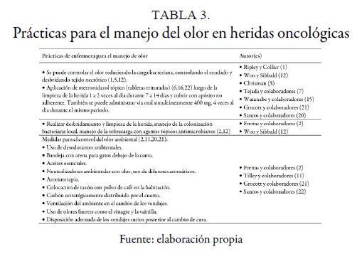 Santos CM da C, Pimenta CA de M, Nobre MRC. A Systematic review of topical treatments to control the odor of malignant fungating wounds. J Pain Symptom Manage [Internet]. 2010;39(6):1065-76. Disponible en: https://www.jpsmjournal.com/article/S0885-3924(10)00246-0/abstract